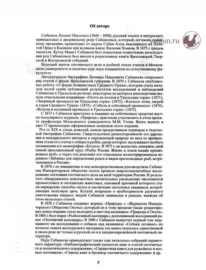 Книги Леонида Павловича Сабанеева, признанного знатока охоты, стали классикой жанра. Тот, кто не читал их, вряд ли может называть себя настоящим охотником. Всю свою жизнь Л.Сабанеев посвятил исследованиям и наблюдениям за окружающей природой во всех её проявлениях, результатами этой деятельности стало огромное количество книг, журналов и прочих публикаций изданных как в России, так и за рубежом. Свою первую работу - "О фауне позвоночных Среднего Урала" - Сабанеев опубликовал ещё в 1870 году, вдумайтесь, в позапрошлом веке! С тех пор, а прошло уже без малого полторы сотни лет, труды Сабанеева не утратили своей актуальности и с неизменным успехом переиздаются.