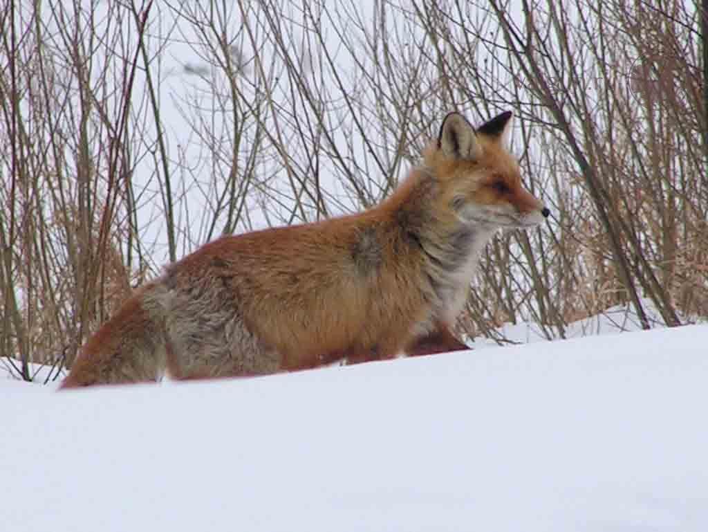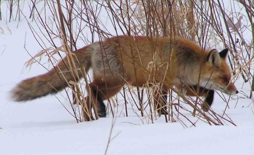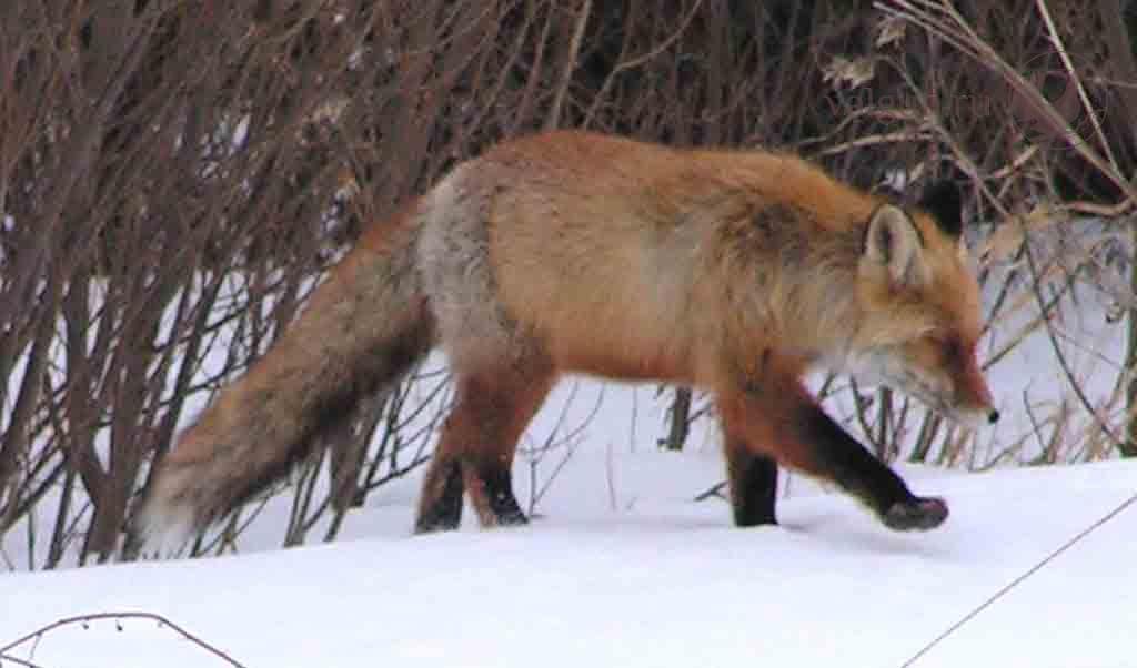 Март месяц. Оттепель. Наст с утра еще кое-как держит, по крайней мере лису. Шел по малоезжей проселочной дороге и вдруг увидел в поле эту самую лису, которая бежит не очень оглядываясь, опустив нос к снегу, слушая и вынюхивая мышей. Прикинув что бежать ей где-то мимо, просто сел и пригнулся за насыпной бровкой, приготовив фотоаппарат. И в самом деле, тишком да бочком, вдоль кустиков подошла довольно близко и увидела меня уже почти совсем выйдя на дорогу. Последним в видоискатель попал только взметнувшийся из-под ног снег да взмах хвоста...
