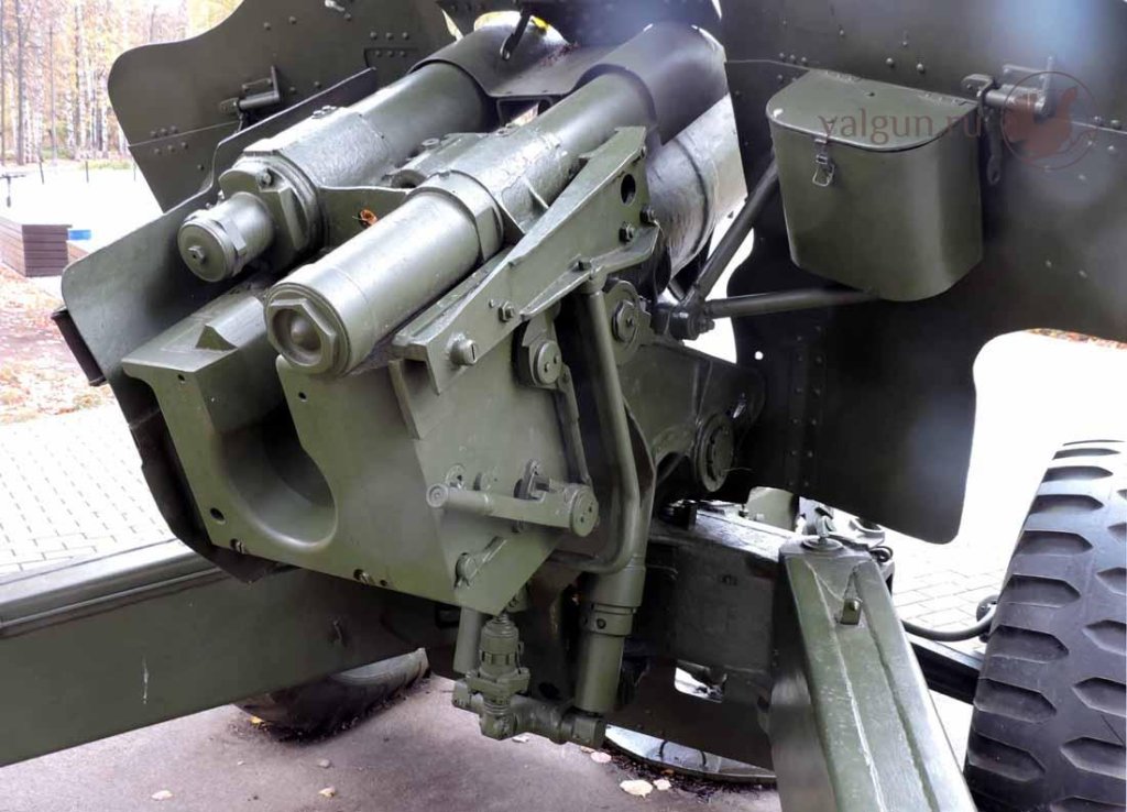 Затвор клиновой, вертикальный, сколь помню еще со времен учебы (уж 45 лет тому как) аж 120 килограммов. Противооткатные сверху, за счет этого профиль ниже. Казенник короткий, значит яму между станинами копать надо мельче, когда высоко поднятый ствол откатывается. И окоп поменьше, чем для МЛ-20. Шестидюймовый сорокакилограмовый "чумадан" и до сих пор очень убедительный аргумент. Весь мир давно на самоходках, а у нас вот так.
