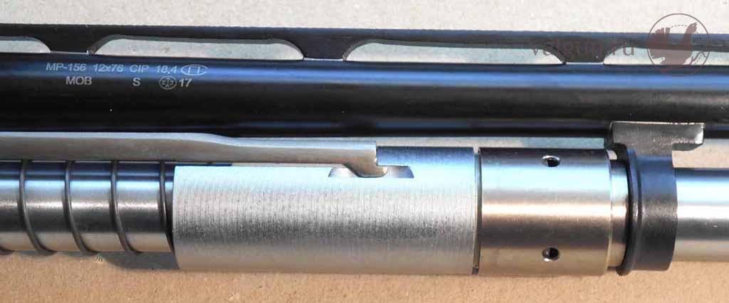 При осмотре МР-156 на верхней стенке паза коробки (она же -"потолок" выборки под подвижные части) обнаруживаются риски. Аналогичные риски видим и на МР-155. Эти бороздки образуются от ударов о стенку края запорной грани клина – то есть клин пытается закрыться каждый раз, когда затвор встречает что-нибудь на своём пути, например, досылаемый патрон или край патронника. На упомянутом выше автомате Калашникова такому явлению расклинивания (запирания затвора при движении, например в момент досылания патрона) препятствует специальный вставленный в ствольную коробку сухарь, который «разрешает» запирание только в самый последний момент, когда патрон уже дослан в патронник. А американцы, как известно, на М16 вообще обошлись внешним досылателем затвора. Ну что сказать? С одной стороны, ни на МР-153, ни на МР-155 это самое расклинивание устранено не было, а работают ружья достаточно надёжно. С другой стороны и энергии на МР-156 значительно меньше…