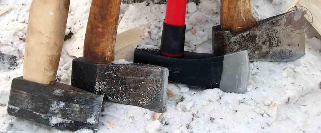 В тот раз выбор колунов у нас был большой, рубщиков - четверо, каждый мог выбрать «струмент» по руке, ну и другие опробовать. Вот из этих колунов, которые на фото, первый справа - литой, самой простой клиновой формы. Ну не было в 80-х особого выбора в магазине, были только разговоры о всяких хитрых формах да самоколющих роликах на клине колуна. Ручку делал сам, под свою руку, с обязательным утолщением на конце, ошкурил, пропитал олифой. Послужил тот колун славно, хотя видно, что кому-то из молодежи был длинноват.
