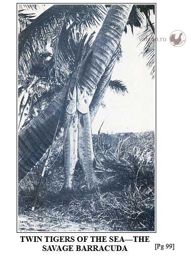 Всякий раз, когда я забрасывал одну из них, на нее попадала крупная рыба и либо срывала крючки, либо ломала мою снасть. Некоторые из этих рыбок выпрыгивали из воды. Мне они показались похожими на барракуд, только были почти такими же серебристыми, как тарпон. Одна из них достигала десяти футов в длину и была размером с телеграфный столб. Когда эта особь всплеснула и прыгнула, Мануэль закричал: "Необычная!" Я изо всех сил старался поймать одну особь, и многие попались на крючок, но они всегда ускользали, я тогда не знал, как знаю сейчас, что в Карибском море барракуда вырастает до двенадцати футов. Этот факт упоминается в записках о природе.